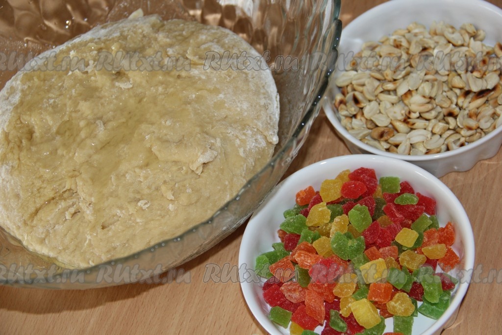 Ещё раз хорошо вымесить тесто, чтобы цукаты и орехи равномерно распределились в тесте.