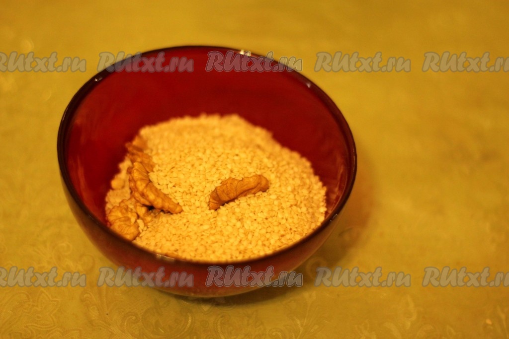 Смешать орехи и кунжут.