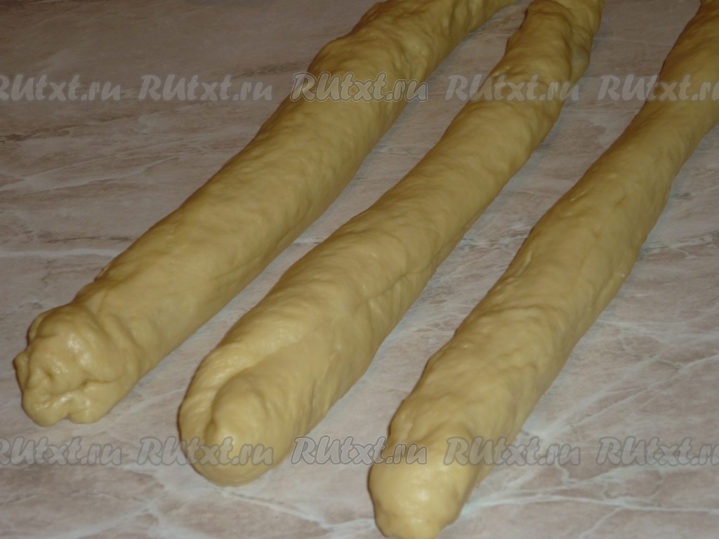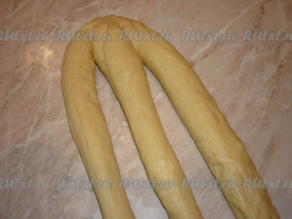Когда тесто подойдёт, разделяем его на 4 равные части. Одну часть откладываем в сторону, а три части раскатываем, чтобы получились пласты теста одинаковой длины. На каждый пласт кладём свою начинку: на один - сахар с молотой корицей, на второй пласт - изюм, а на третий - измельчённые орехи.