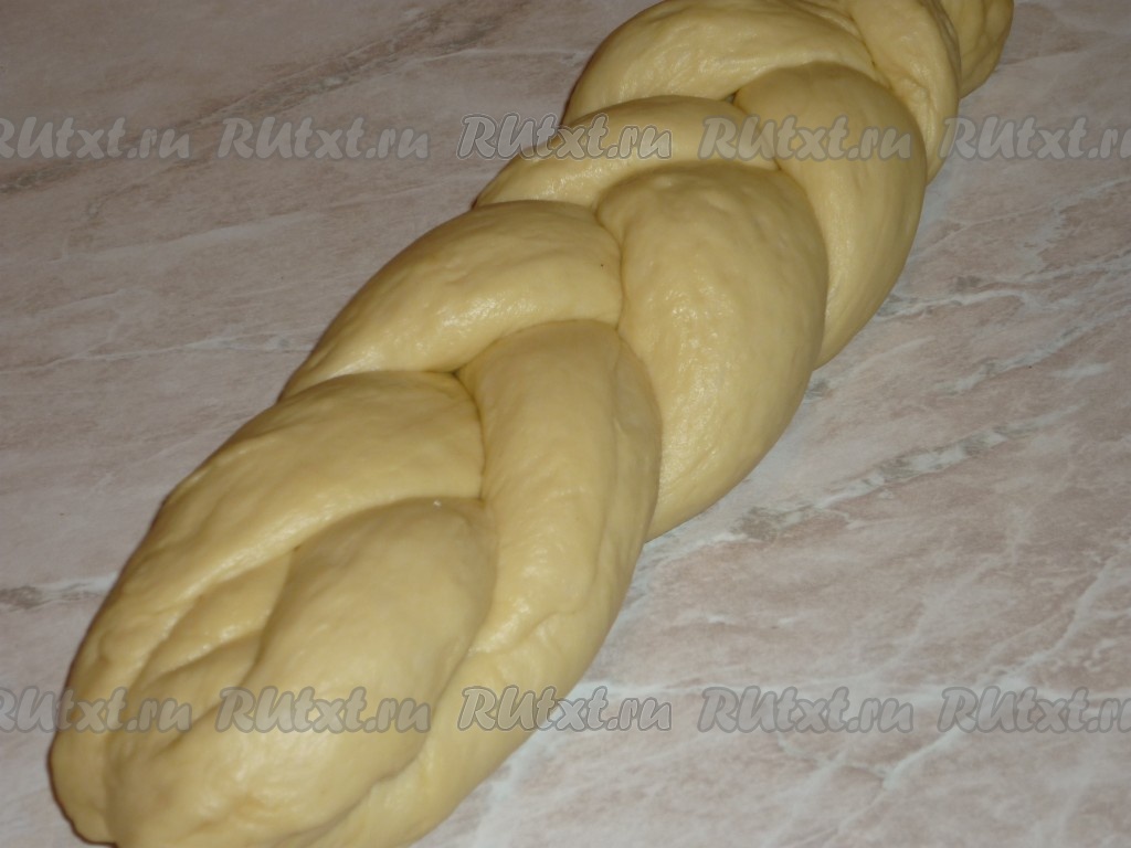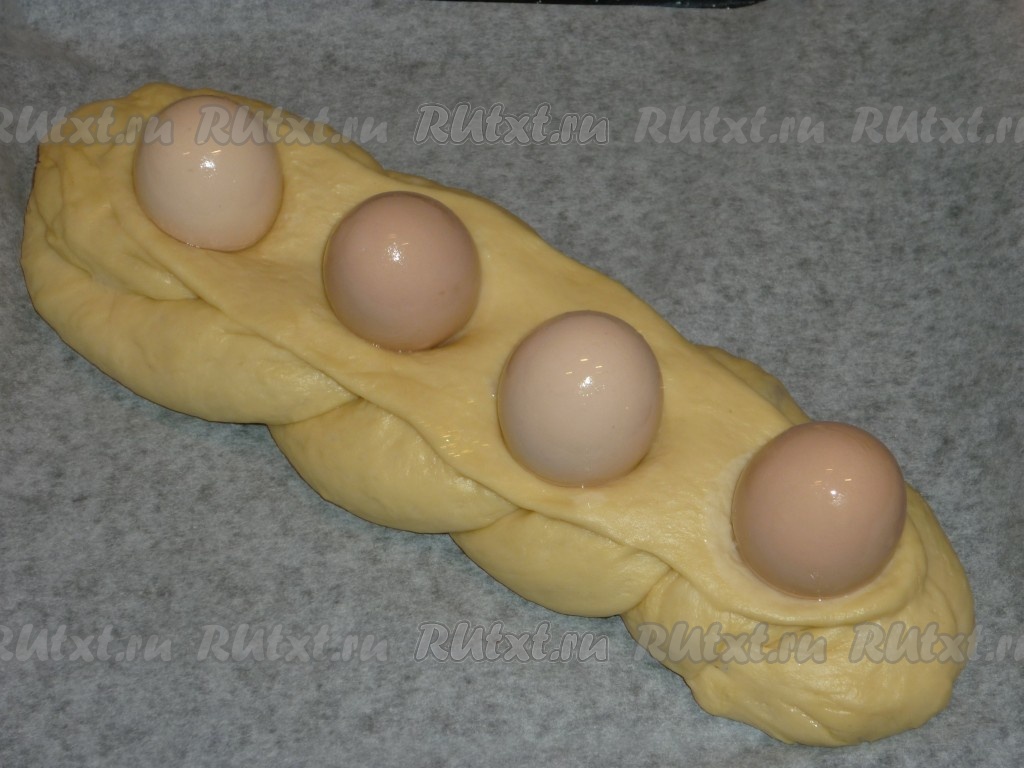 Четвёртую часть теста отдельно раскатываем и выкладываем на косичку. Четыре яйца тщательно моем с содой, смазываем яйца растительным маслом и усаживаем сверху на верхний пласт (как на фото).