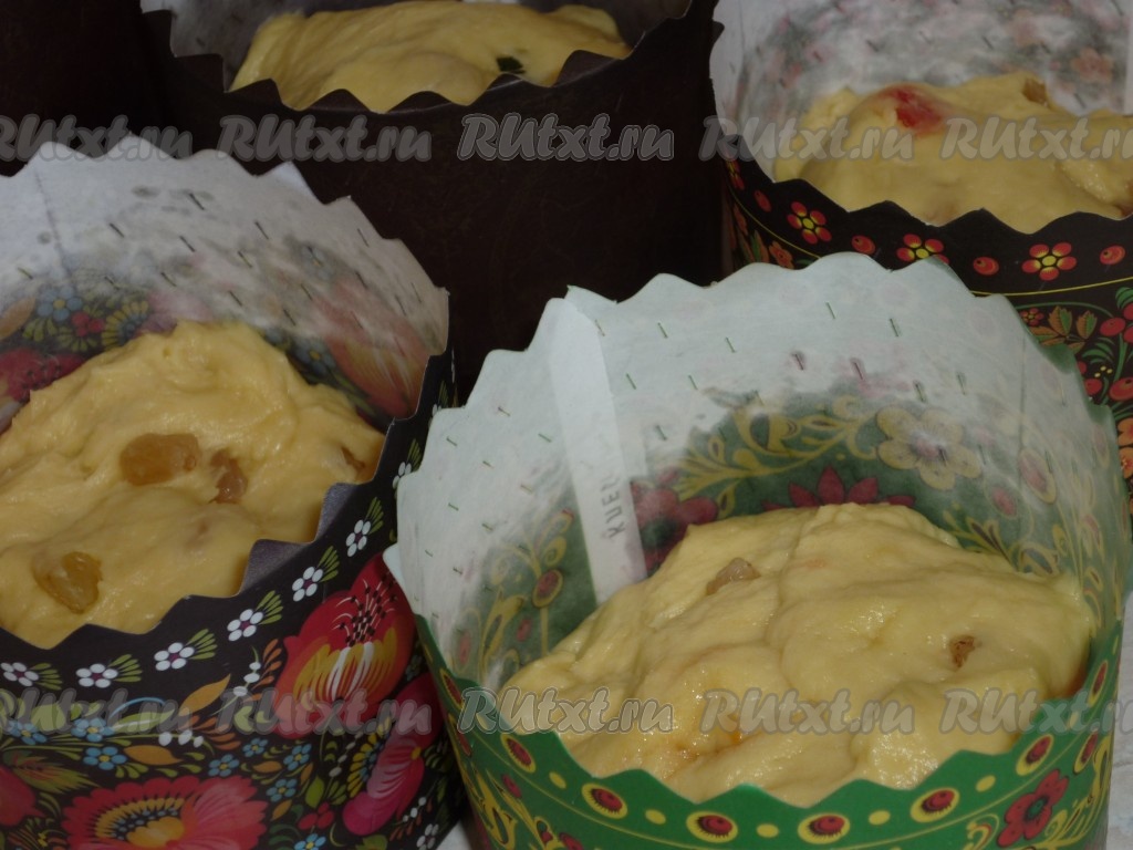 Формы для куличей, смазанные сливочным маслом, на 2/3 заполняем тестом и оставляем для подхода на 15-20 минут.