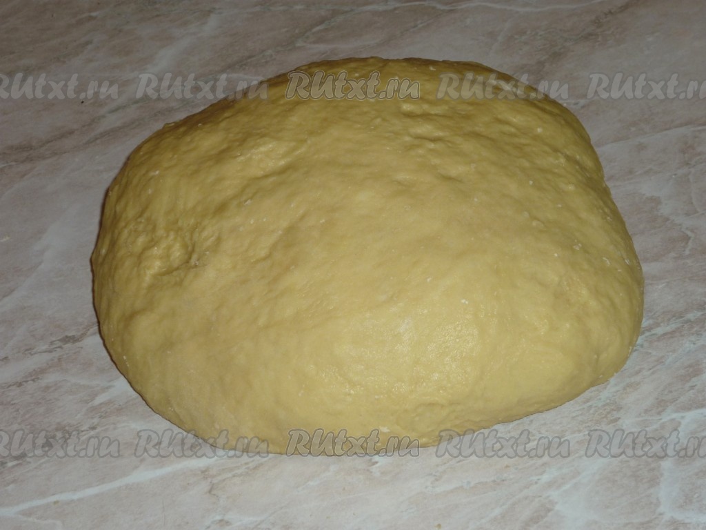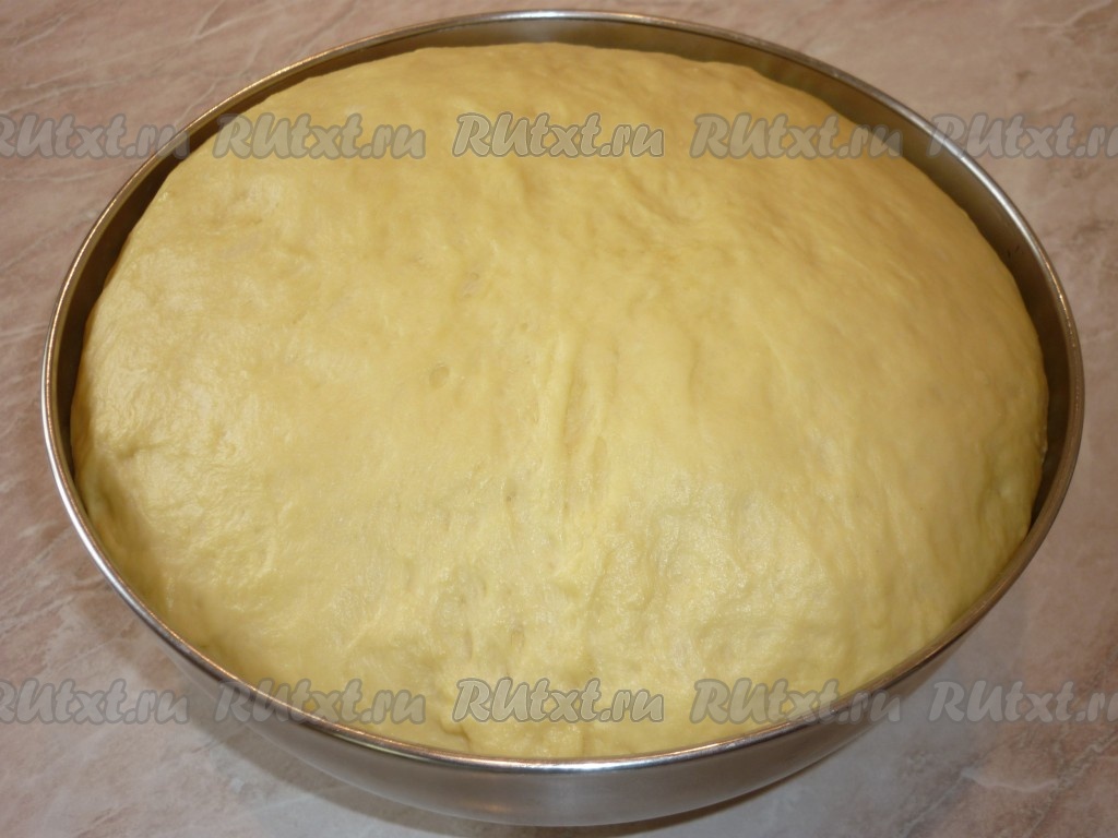 Когда опара подойдёт, добавляем по очереди взбитые яичные желтки, остывшее растопленное сливочное масло и белки, взбитые до устойчивых пиков. Хорошо перемешиваем, всыпаем оставшуюся просеянную муку и замешиваем мягкое тесто. Тесто перекладываем в миску и оставляем на 1 час для подъёма.
