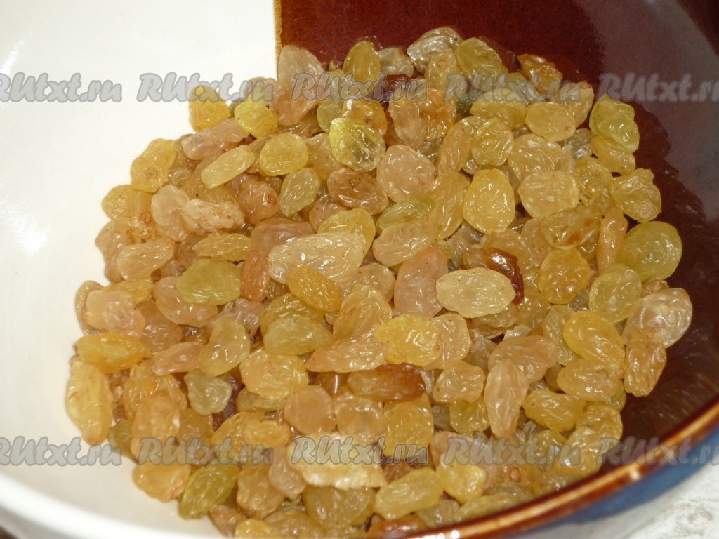 Изюм промываем, заливаем на 10 минут кипятком, затем воду сливаем и даём изюму обсохнуть.