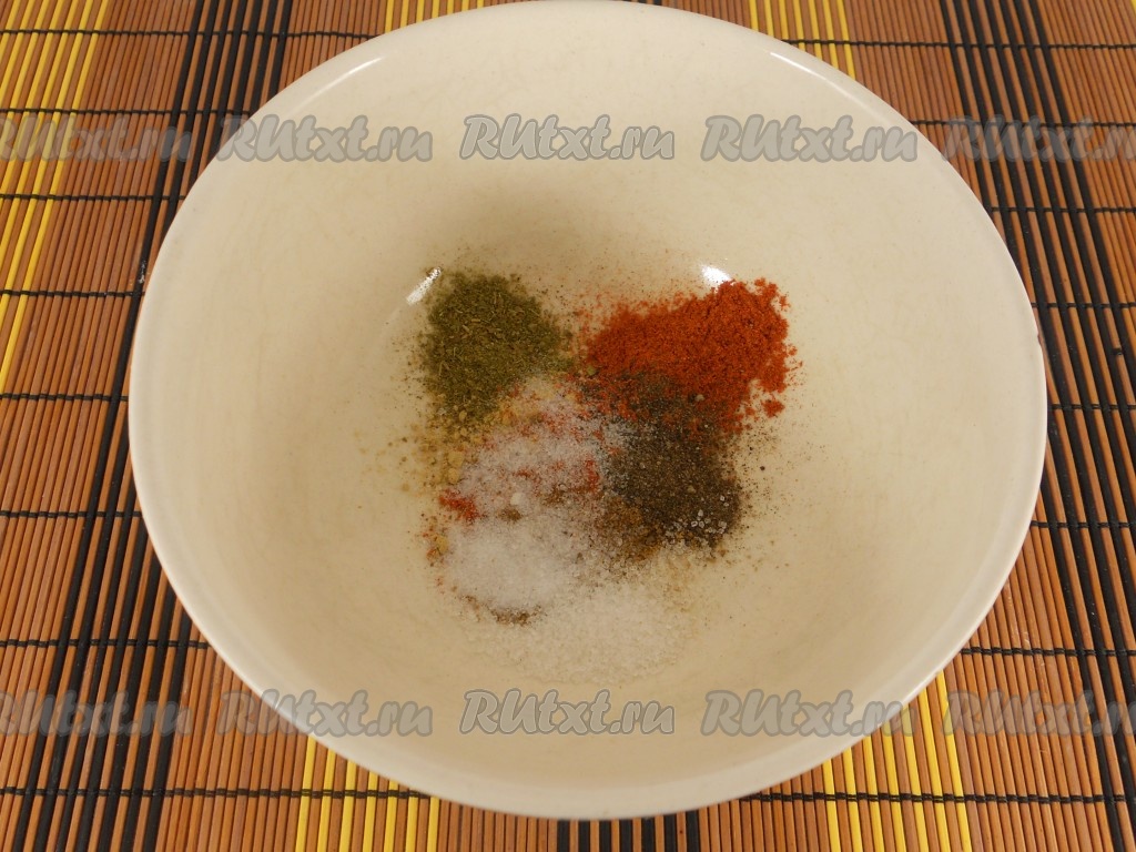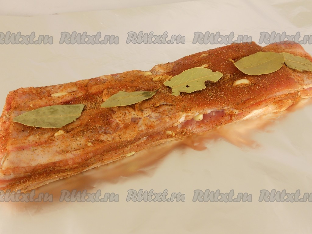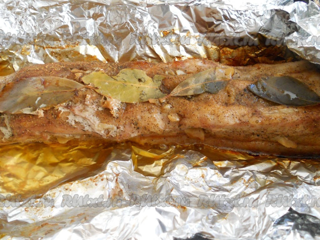 Выложить грудинку на лист фольги, сложенный вдвое. Натереть хорошенько подготовленной смесью специй. Сверху выложить лавровый лист.