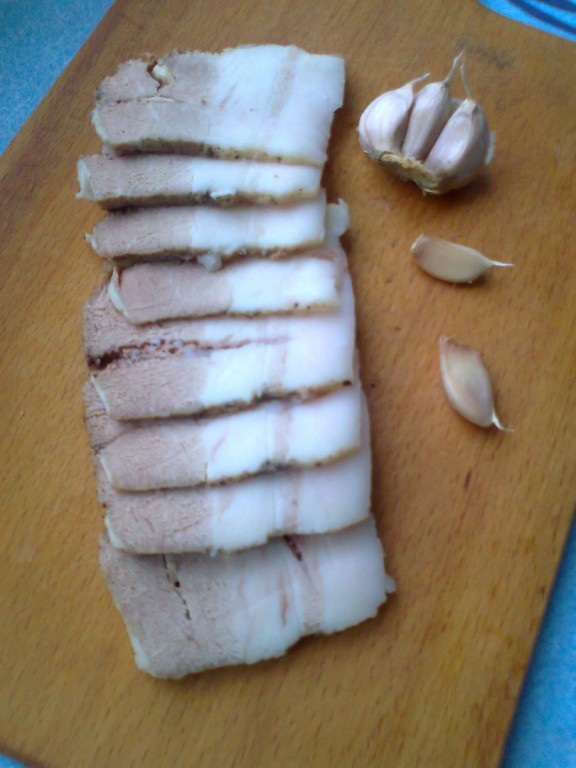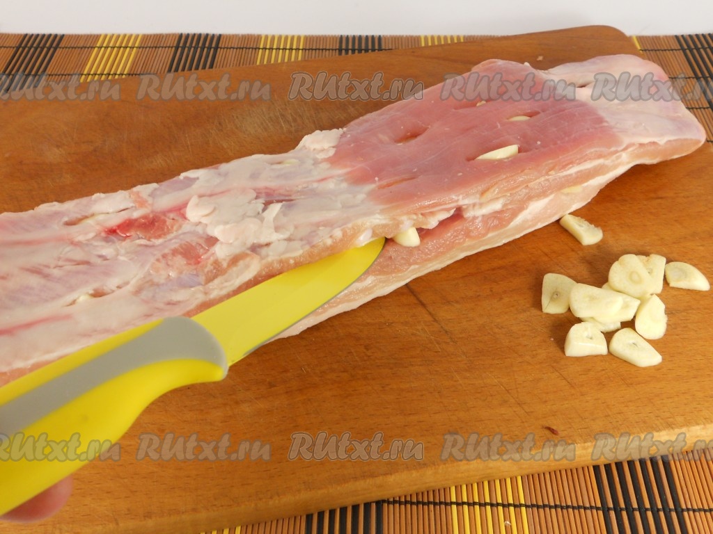 Нашпиговать грудинку порезанными кусочками чеснока.