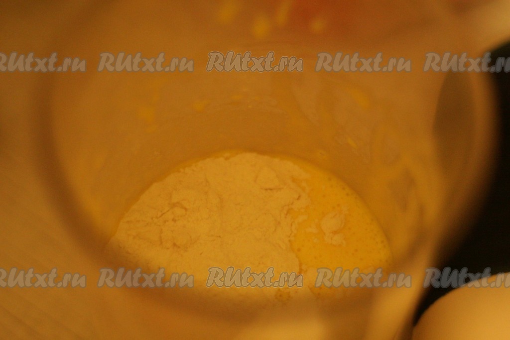 Муку смешать с крахмалом. Постепенно добавить муку во взбитые яйца, перемешивая на маленькой скорости миксера.