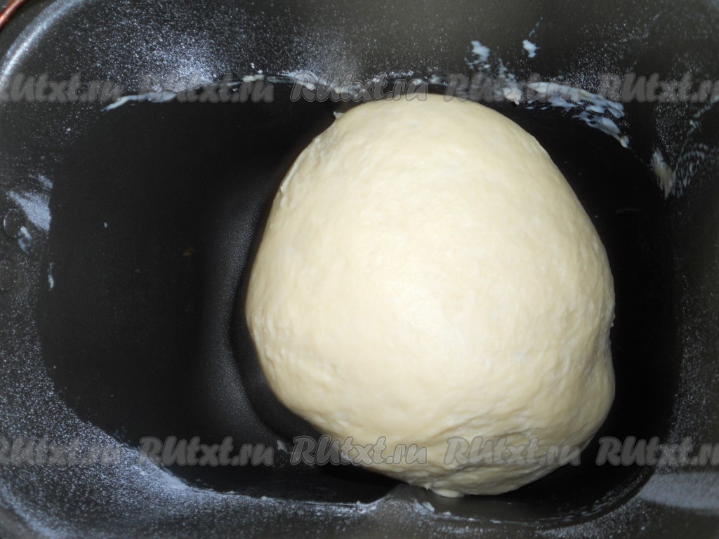 Выставить режим хлебопечки "Тесто" (у меня 1 час 30 минут). За колобком теста нужно проследить, муки может понадобиться чуть больше. Тесто должно быть мягкое, но не липнущее.