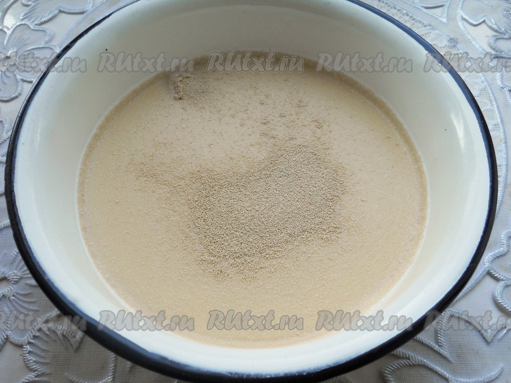 Молоко подогреть, всыпать дрожжи, перемешать до растворения. Все продукты должны быть комнатной температуры.