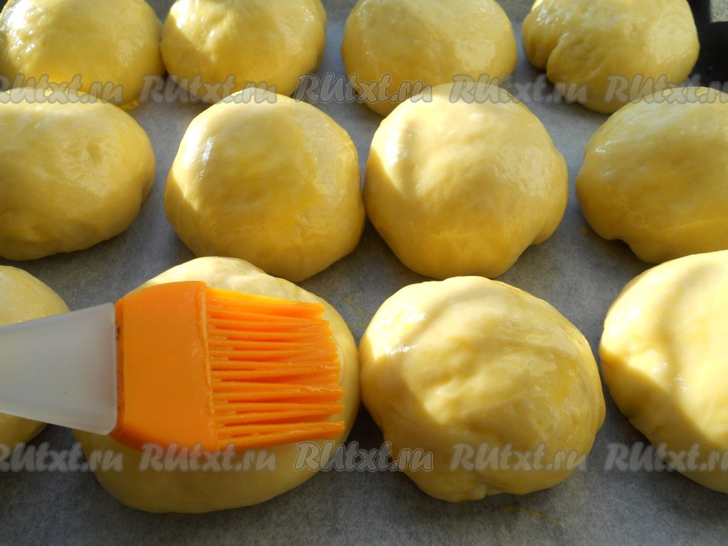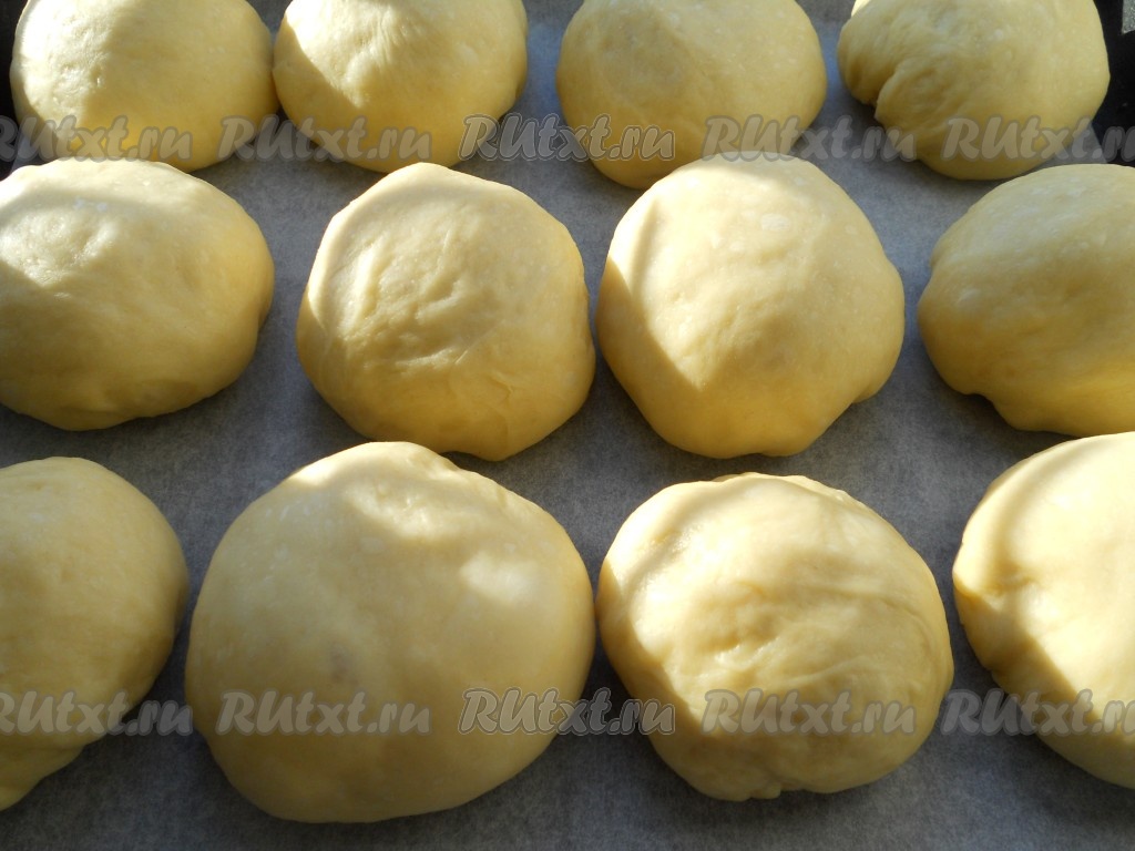 Тесто, приготовленное в хлебопечке, немного обмять и разделить на 12 частей (каждая часть приблизительно по 100 грамм), скатать колобки. Выложить булочки на противень, застеленный пергаментом, на небольшом расстоянии друг от друга.