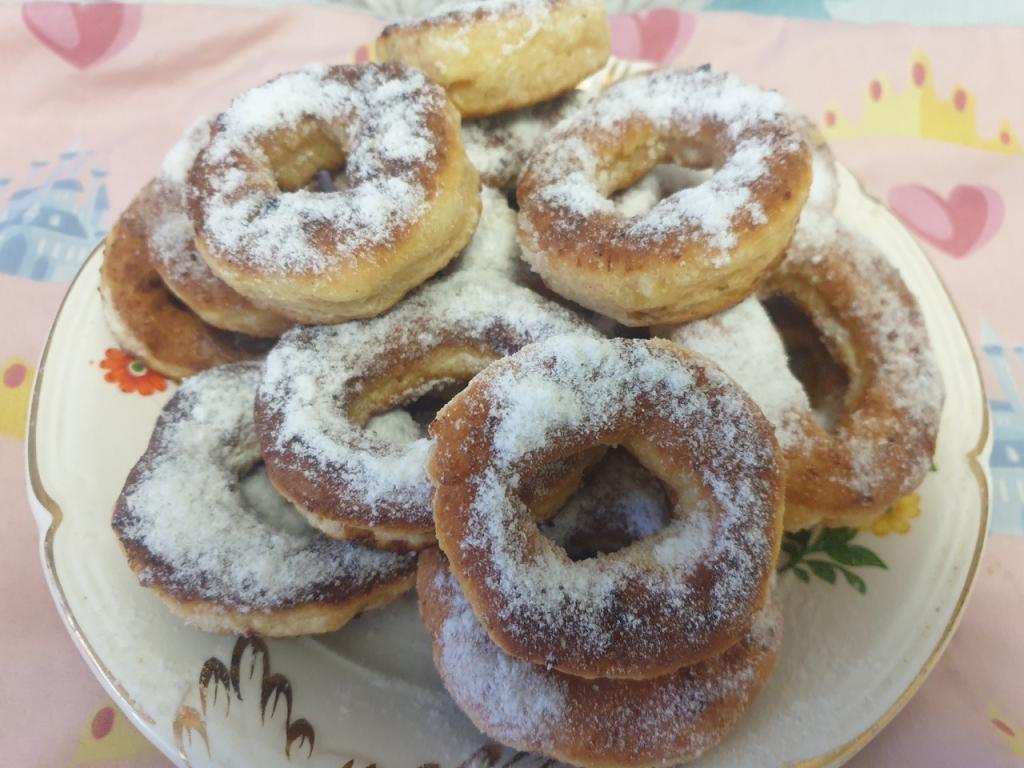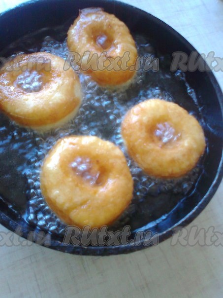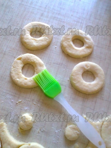 Скалкой раскатать тесто до толщины 0,3-0,5 см. Стаканом вырезать круги, в середине каждого круга вырезать отверстие меньшего диаметра (я использовала крышку от минералки).
