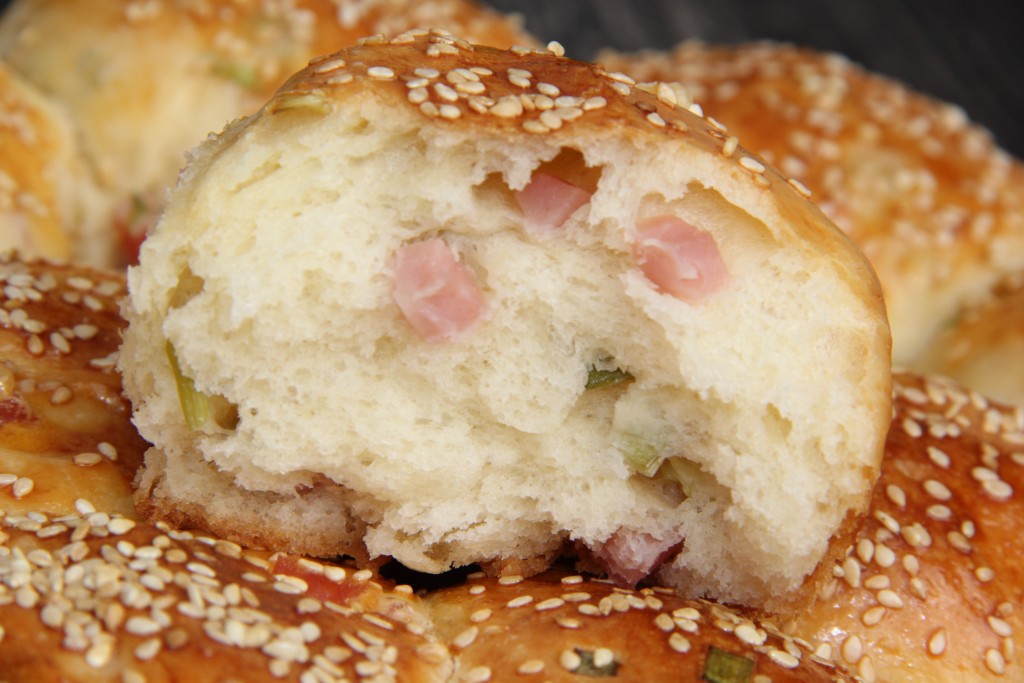 А вот какой разлом у наших дрожжевых булочек с колбасой. Посмотрите, какой мягкий и нежный мякиш. Очень вкусно и сытно!