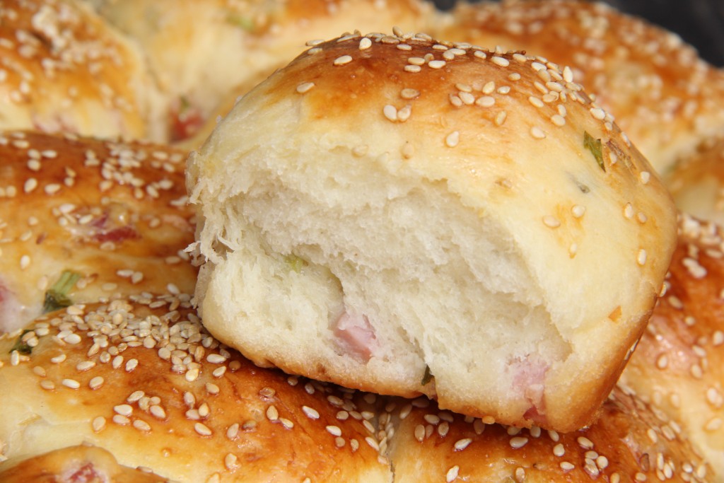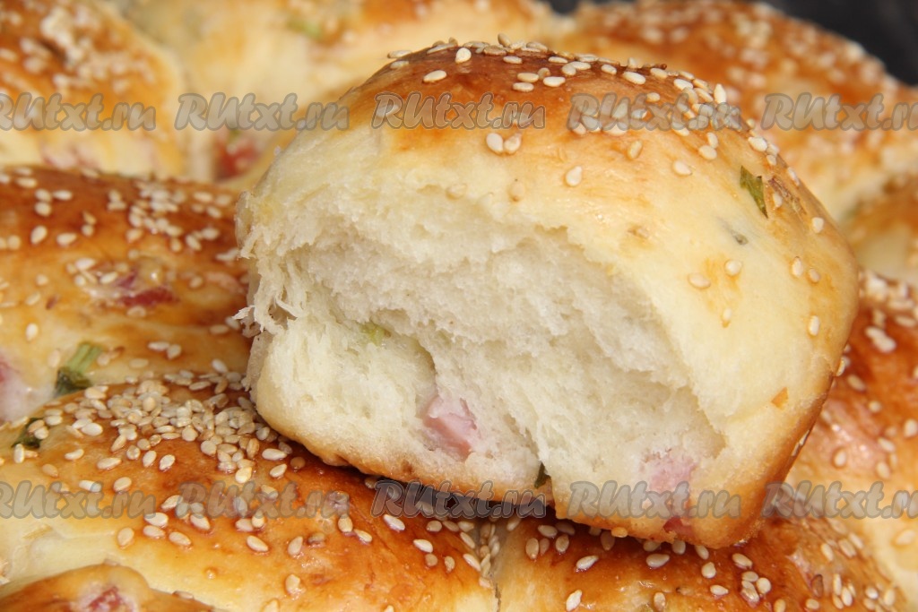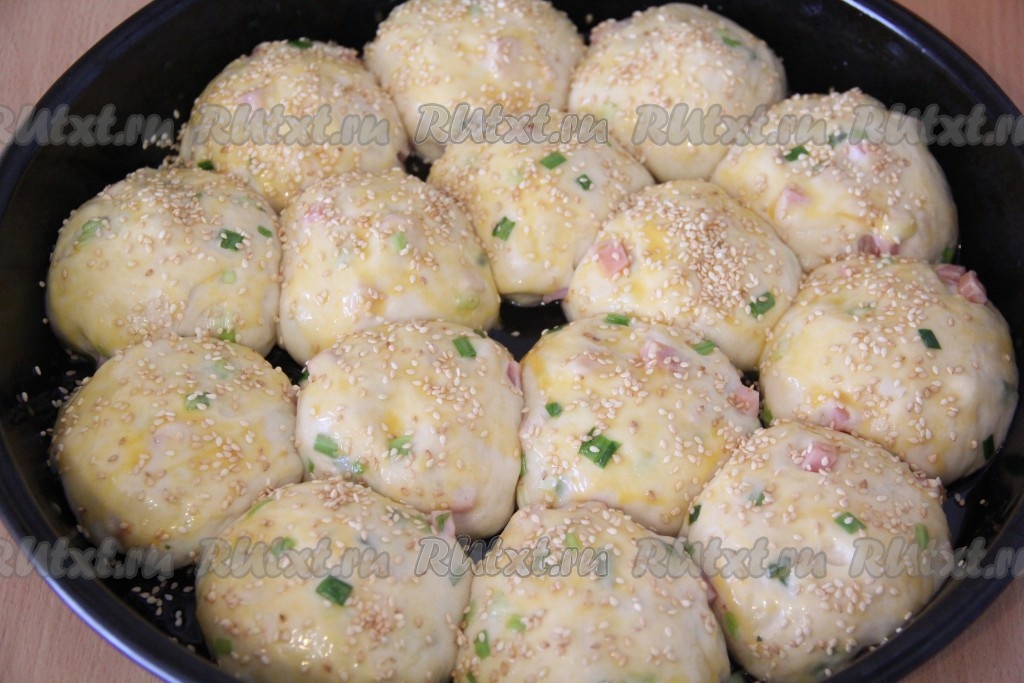 Поднявшиеся булочки смазать молоком, по желанию, посыпать сверху кунжутом.