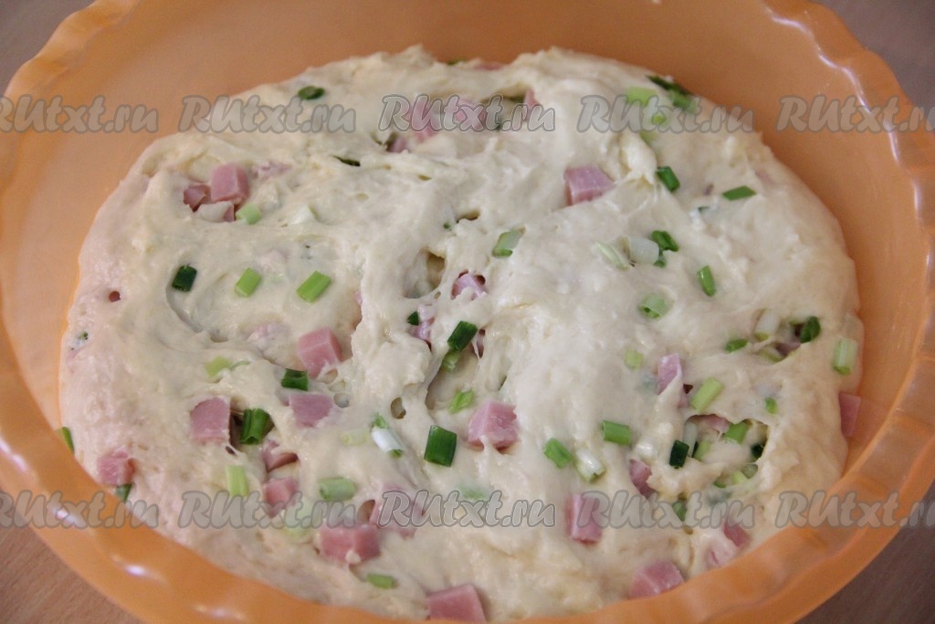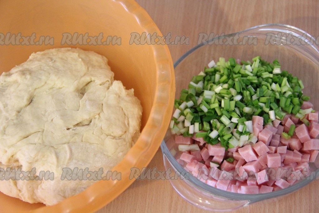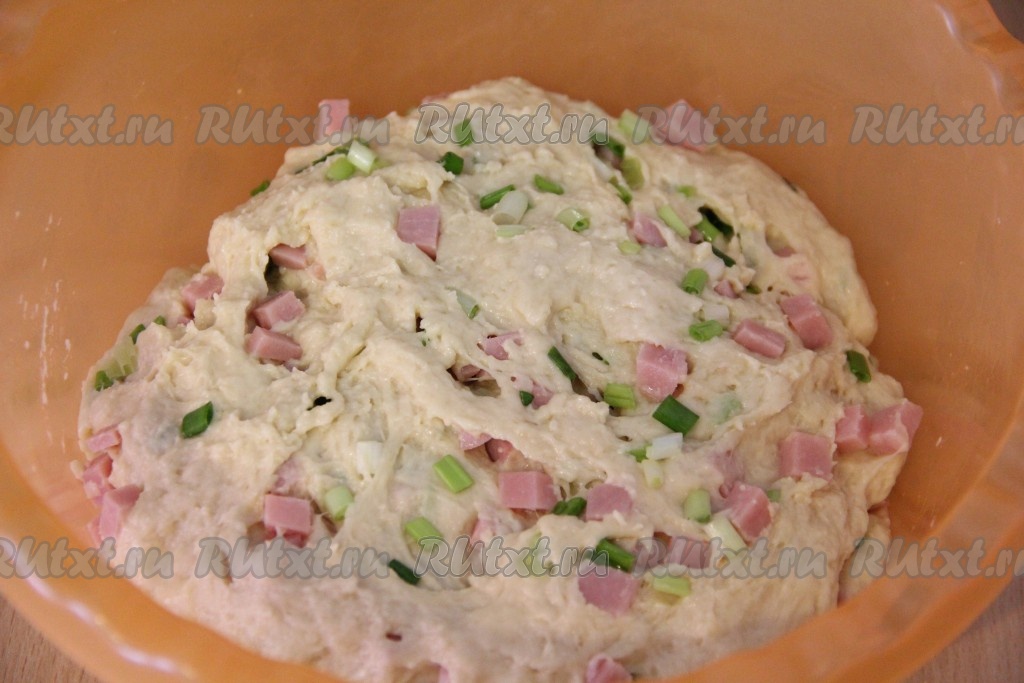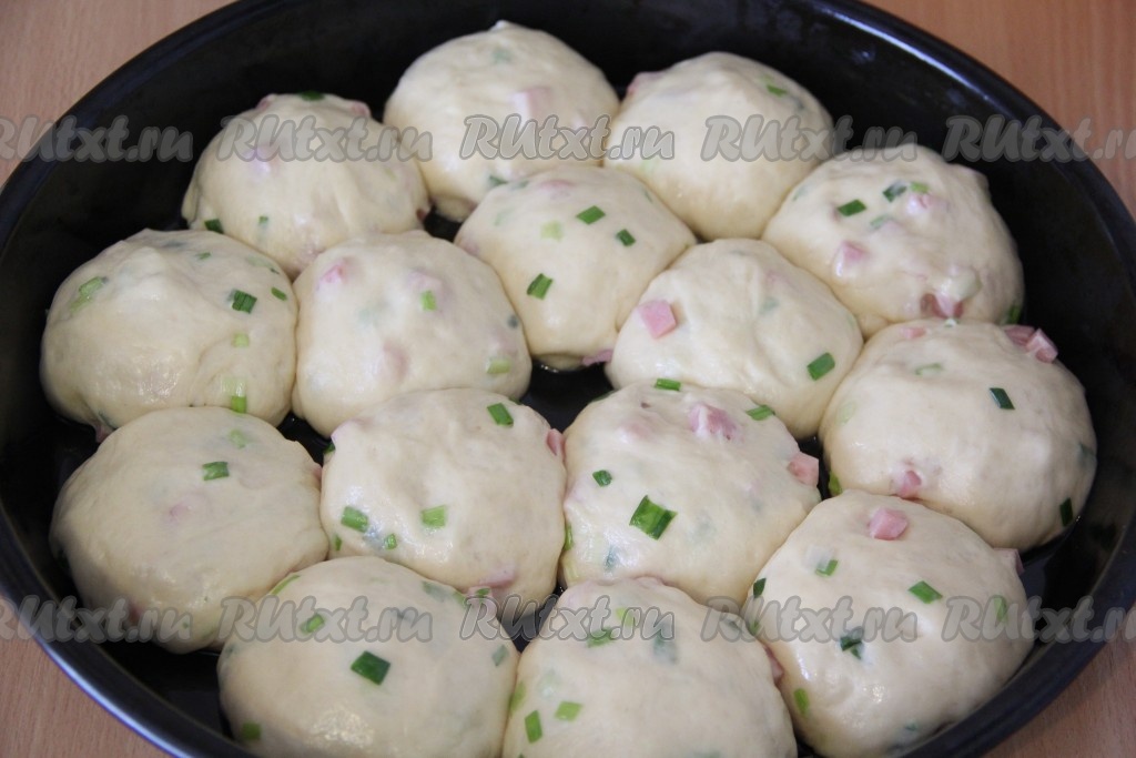 Переложить тесто в глубокую миску, смазанную растительным маслом, добавить колбасу и лук, вымесить тесто. Миску с тестом накрыть полотенцем и поставить в тёплое место на 1-1,5 часа (до увеличения в объёме, как минимум, в 2 раза).