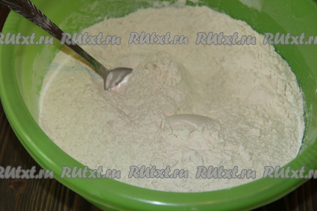 Муку просеять в глубокую миску, сюда же всыпать соль, сахар, сухие дрожжи, перемешать. Затем добавить в мучную смесь растопленное сливочное масло комнатной температуры и 200 миллилитров тёплого молока, перемешать. Температура молока должно быть не выше 40 градусов.