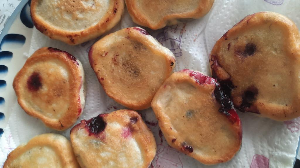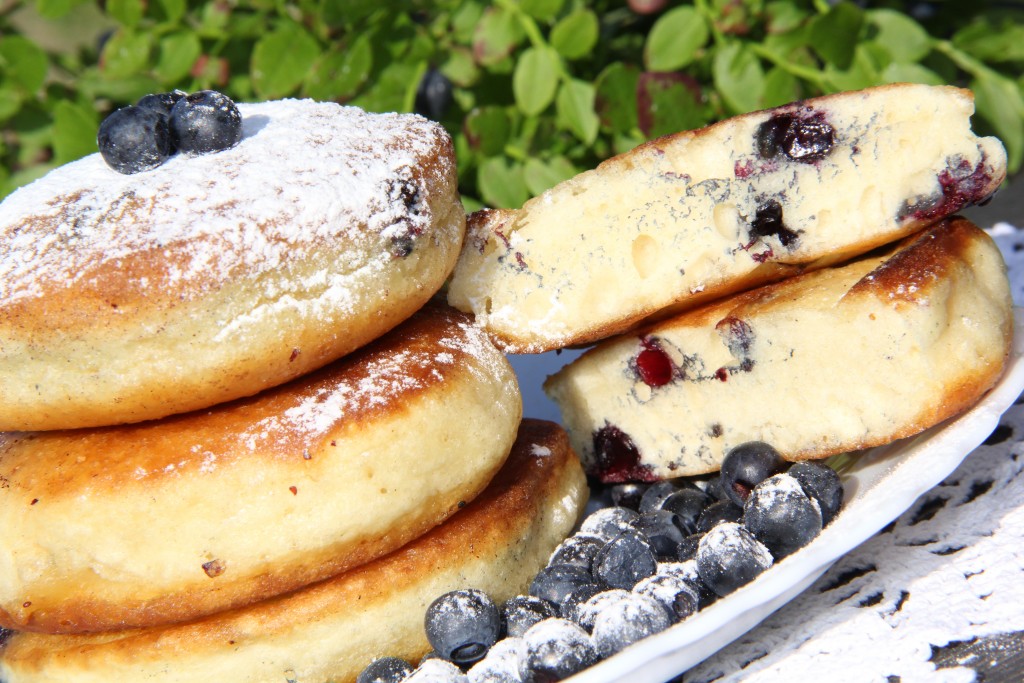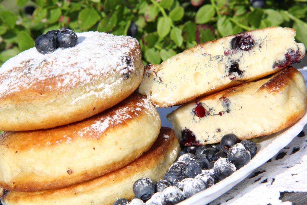 Вкусные и пышные оладьи с черникой, замешанные на кефире, подать к столу со сметаной или сладким соусом.