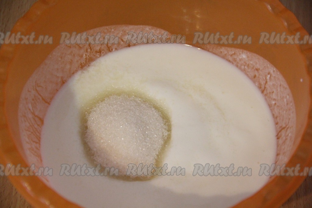 Кефир влить в глубокую миску, всыпать соду и перемешать. Кефир начнёт пузыриться, это говорит о том, что сода погасилась. Далее добавить сахар и хорошо перемешать.
