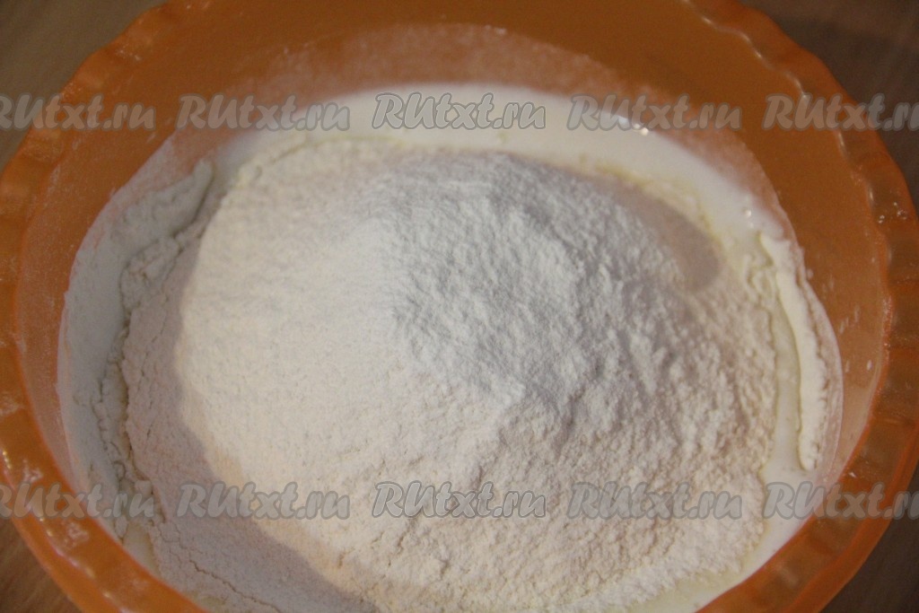 Затем всыпать просеянную муку, перемешать ложкой до однородного состояния.
