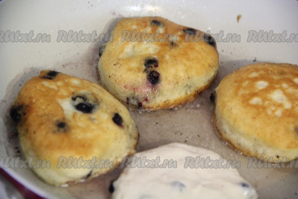 Сковороду для выпекания хорошо разогреть, добавить растительное масло (масла не жалеть!). Выкладывать по 1 столовой ложке теста, формируя оладушки. Жарить оладьи с черникой с двух сторон на среднем огне до золотистого цвета. Готовые оладушки переложить на тарелку. Таким образом пожарить все оладьи.