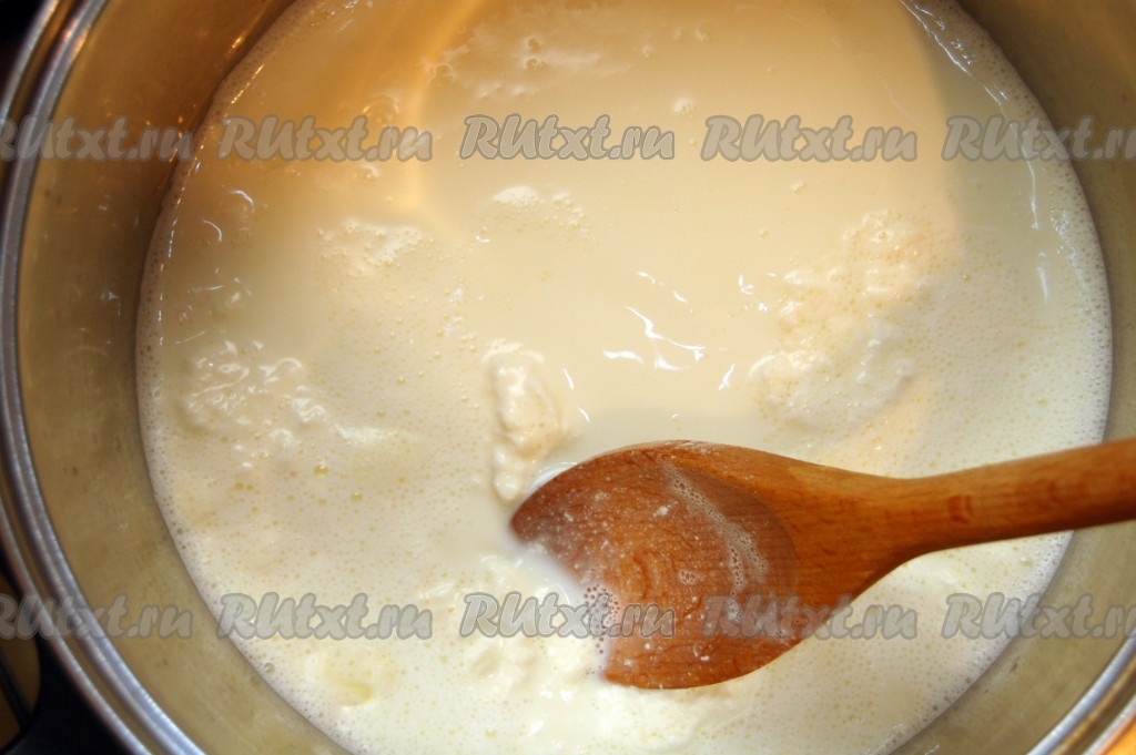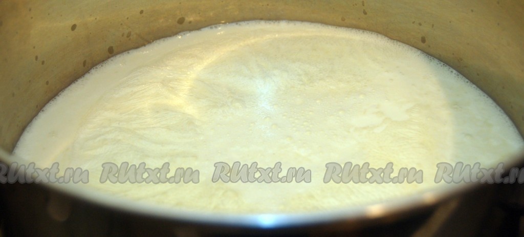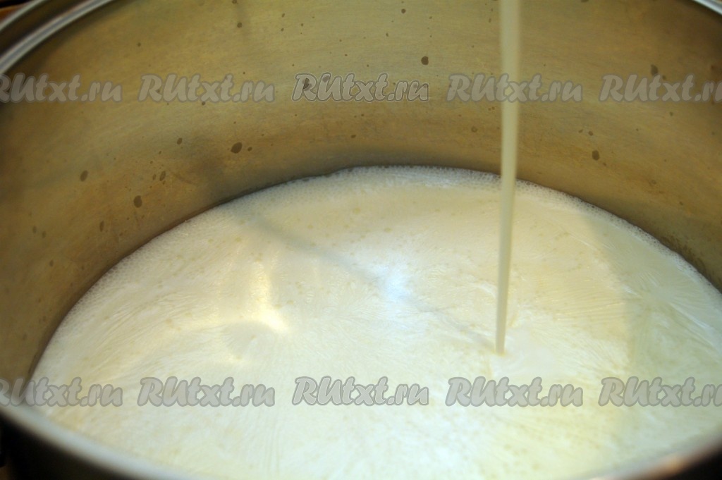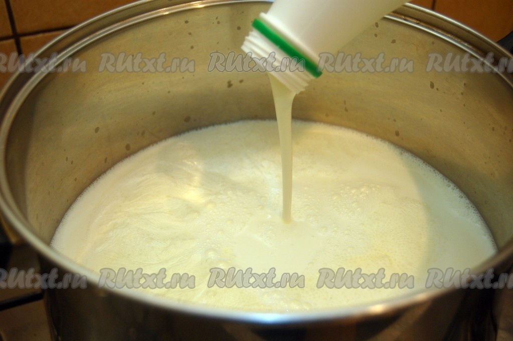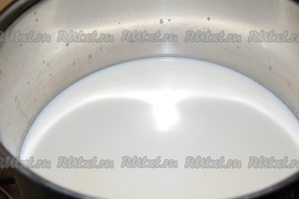 Возьмем большую кастрюлю, перельем в нее молоко и поставим на сильный огонь.