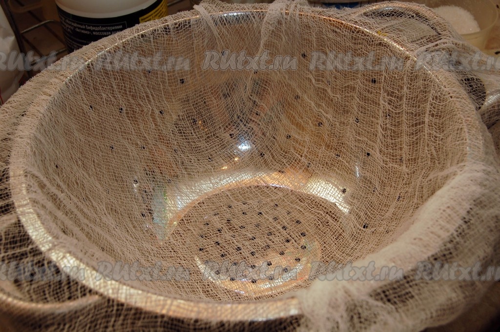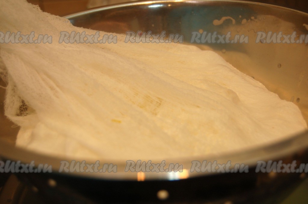 Теперь приготовим дуршлаг, выстелем его марлей.