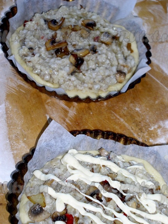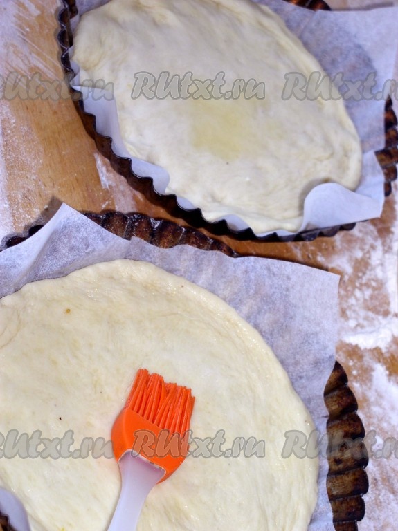 Выложить на тесто подготовленную начинку (чаще всего начинки кладут больше, чем теста, оставляя очень тоненький край теста или вообще без края). Смазать каким-нибудь соусом (постным майонезом, кетчупом и т.п.).