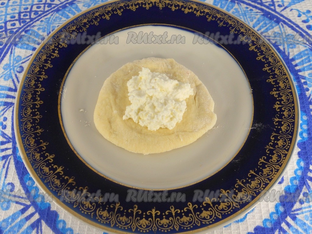 Тесто немного обмять, разделить на части, скатать колбаски и порезать кусочками. Сформировать лепешки. В середину лепешки поместить по ложке творожной массы.