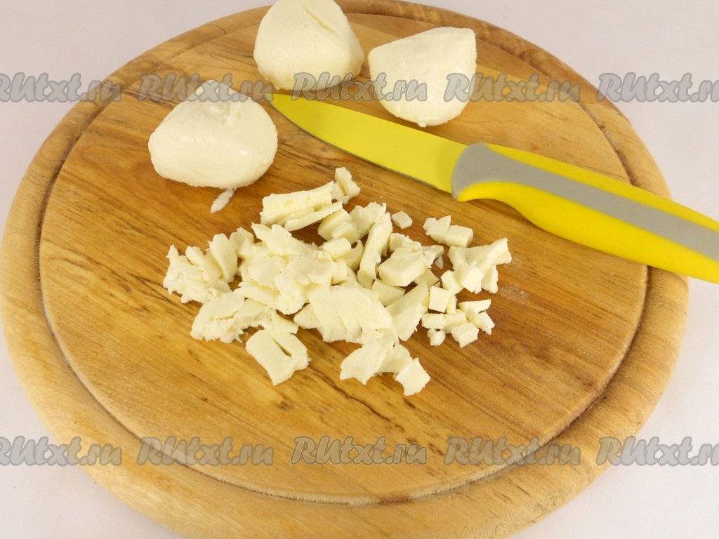 Отдохнувшее тесто раскатать тоненько в виде прямоугольника. Наметить ножом квадраты или прямоугольники (10х10 или 10х8). Я разрезала прямоугольный пласт на 16 частей. На половину из них выложить сыр с зеленью.