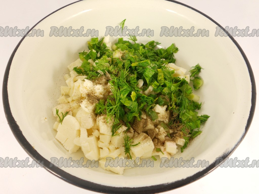 Добавить к сыру измельченную зелень, соль, перец и итальянские травы. Перемешать.