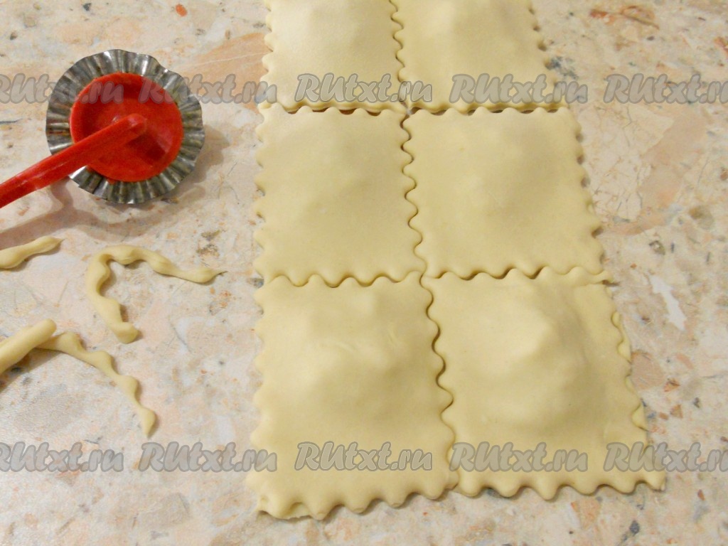 Накрыть второй половиной теста и специальным ножом обрезать все края, придавая форму равиоли.
