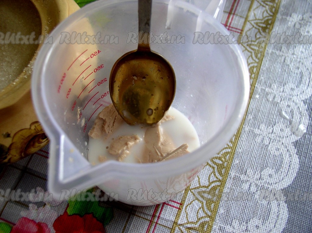 Если готовите со сливочным маслом или маргарином, то их нужно растопить и остудить. Дрожжи смешать с 1 столовой ложкой воды и 1 столовой ложкой сахара. Когда масса вспенится, значит опара готова.
