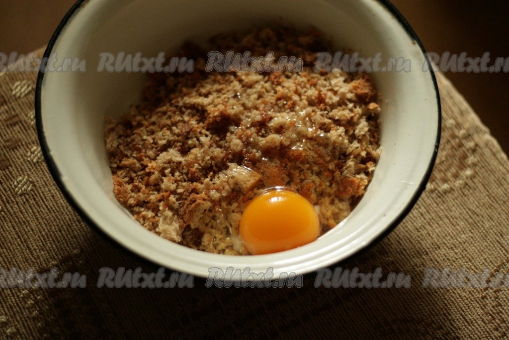Обжарить хлеб на сухой сковородке в течение 5 минут. Снять с огня, дать остыть. Добавить яйцо и воду, втереть руками в хлеб.