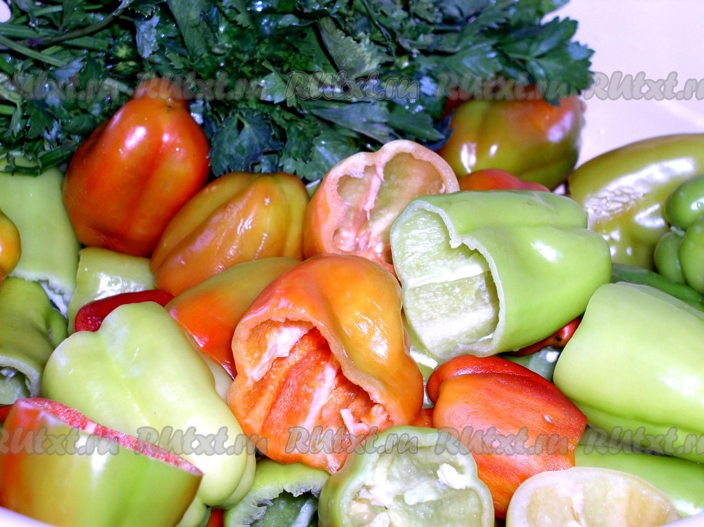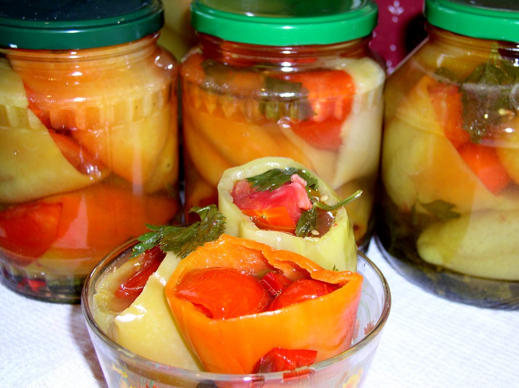 Не хлопотный рецепт приготовления фаршированного перца с помидорами на зиму. По этому рецепту перец получается очень вкусным, а помидоры напоминают свежие. Попробуйте!