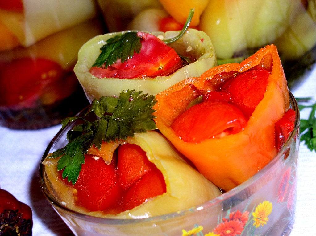 Очень вкусный перец, фаршированный помидорами, готов. Прекрасная закуска для холодных зимних дней.