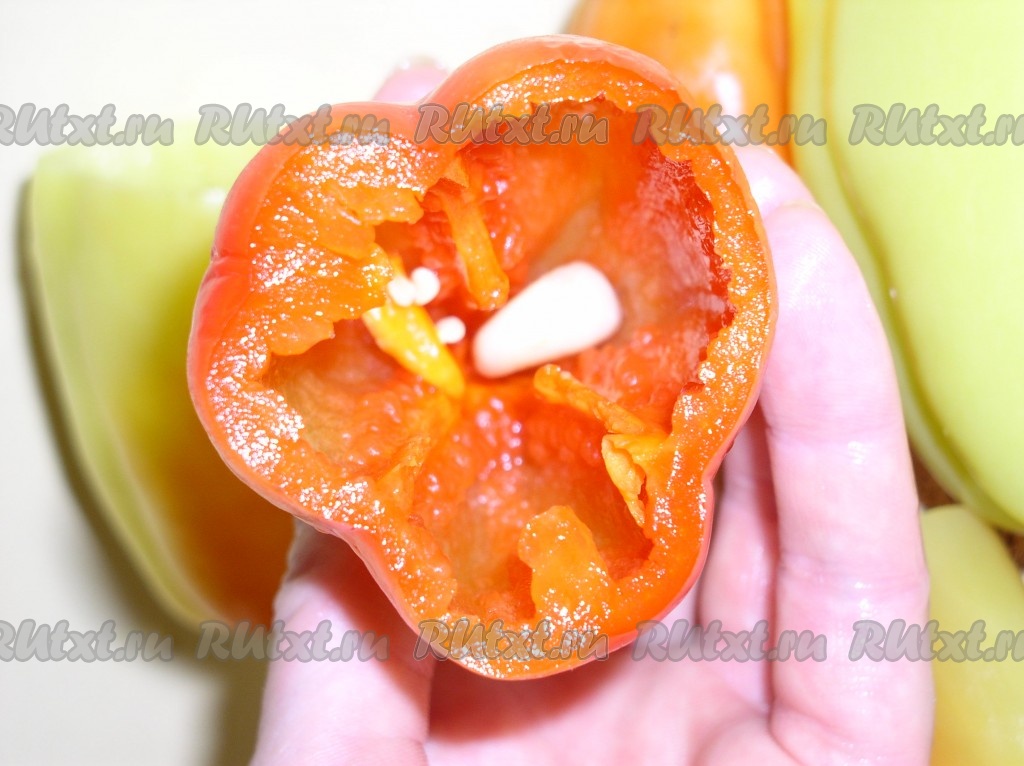 Затем на дно каждого перца укладываем очищенные зубчики чеснока и по 2-4 части заранее нарезанных кусочков помидоров. После чего фаршированные перцы укладываем в стерилизованные банки, заливаем горячим маринадом и закручиваем стерилизованными крышками. Храним в сухом, прохладном помещении.