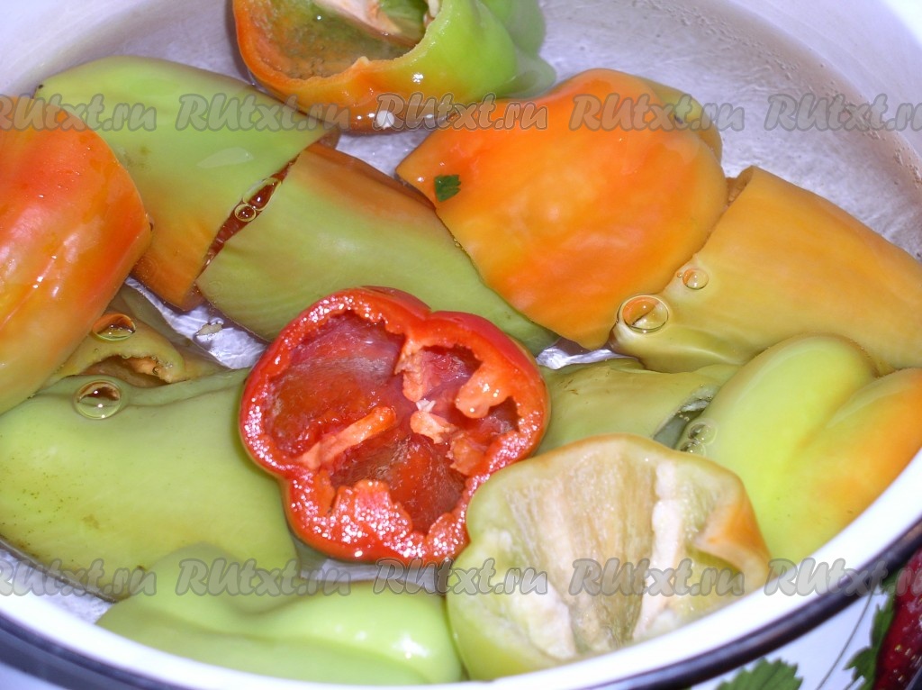 Для того чтобы перцы были не хрупкими и легче укладывались в банки, их бланшируем в кипящей воде в течение 5 минут и сразу охлаждаем в холодной воде. Но можно и пропустить этот шаг.