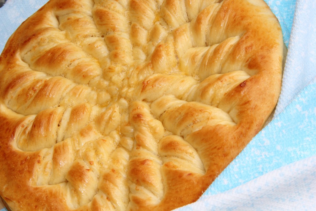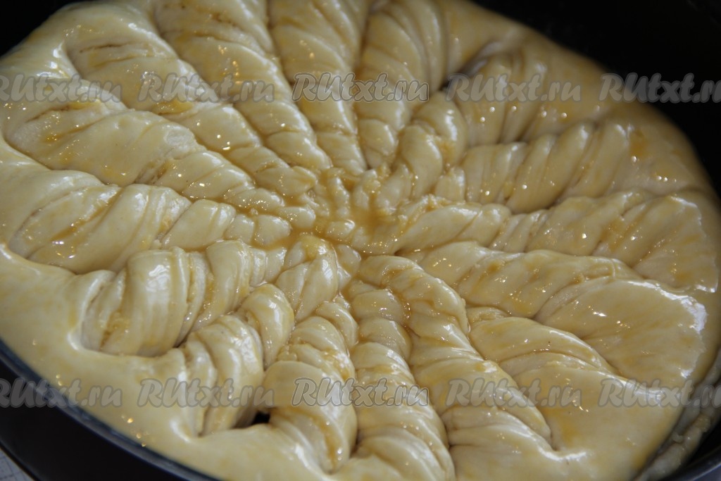 Противень для выпекания смазать растительным маслом. Аккуратно переложить заготовку для пирога в форму. Сделать 8 надрезов от края до края, острым ножом, не прорезая край пирога. У нас получится 16 равных частей треугольной формы. Затем свернуть треугольники в плотные жгутики. Получившийся пирог поставить в тёплое место для расстойки на 20-30 минут.