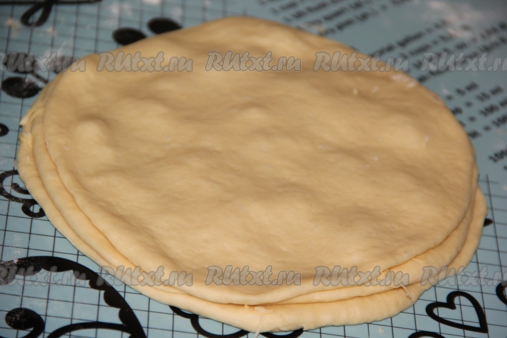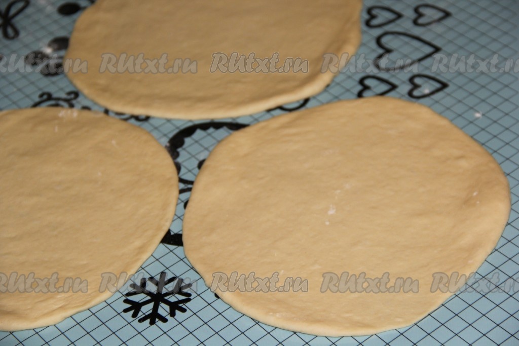 Каждую часть теста раскатать скалкой в круг. Круги должны быть не слишком тонкими и одинаковыми по диаметру.