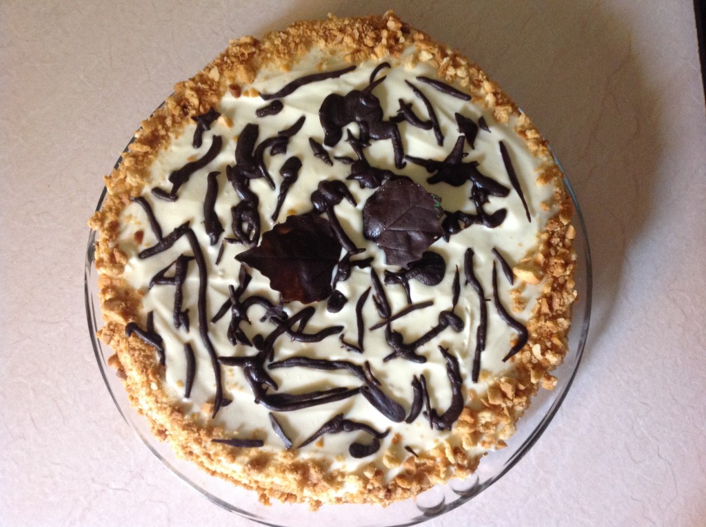 Бока торта обсыпать крошкой из обрезков. Можно также посыпать и верх торта крошкой, но я решила украсить верх растопленным шоколадом. Оставить торт для пропитки на 2 часа при комнатной температуре, после чего отправить его в холодильник (желательно на ночь).