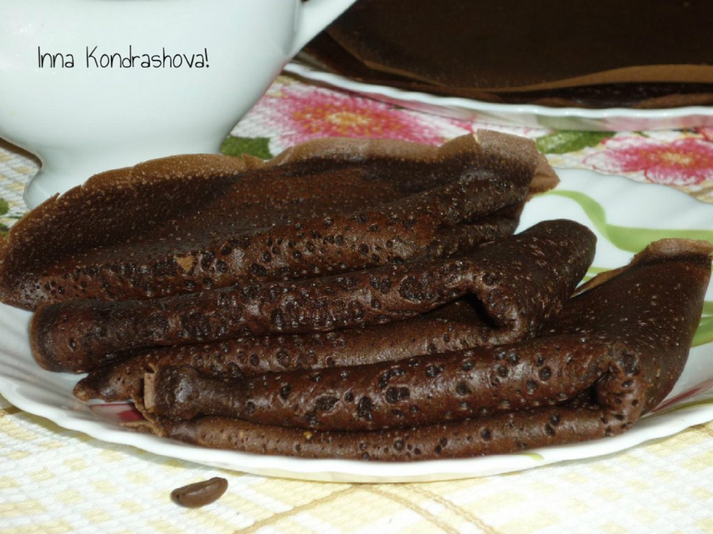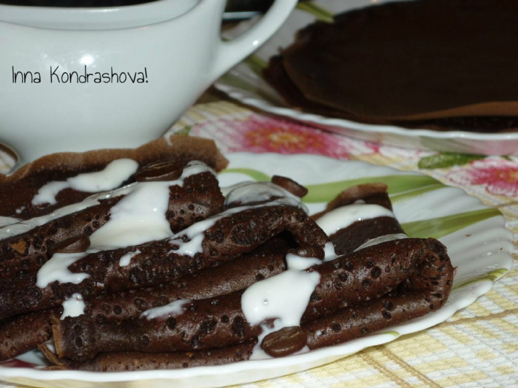 Пористые, ароматные шоколадно-кофейные блины горячими подать к столу, дополнив мёдом, сгущёнкой, сметанным кремом, различными сладкими сиропами.