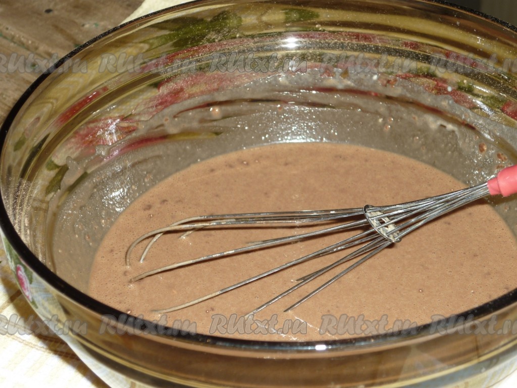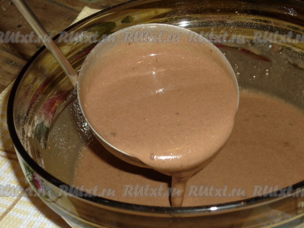 В получившуюся шоколадно-кофейное блинное тесто влить растительное масло, ещё раз тщательно перемешать. Тесто получится однородным, ароматным, в меру густым, как на фото.