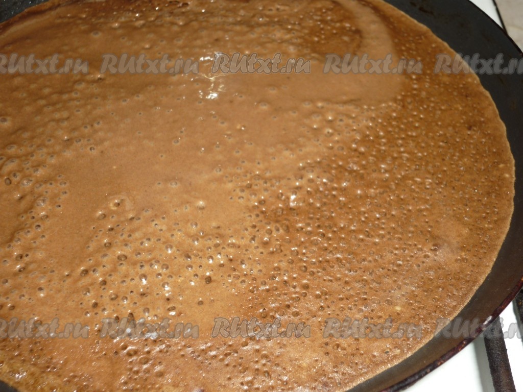 Немного смазать сковороду растительным маслом, разогреть, уменьшить огонь до среднего, а затем влить половник теста, равномерно распределяя тесто по дну сковороды. Когда блин покроется сверху пузырьками и поджарится с нижней стороны, перевернуть его и жарить до подрумянивания с другой стороны. Готовый ароматный шоколадно-кофейный блин переложить на тарелку. Периодически перемешивая блинное тесто и смазывая сковороду маслом по мере необходимости, постепенно пожарить все блины.