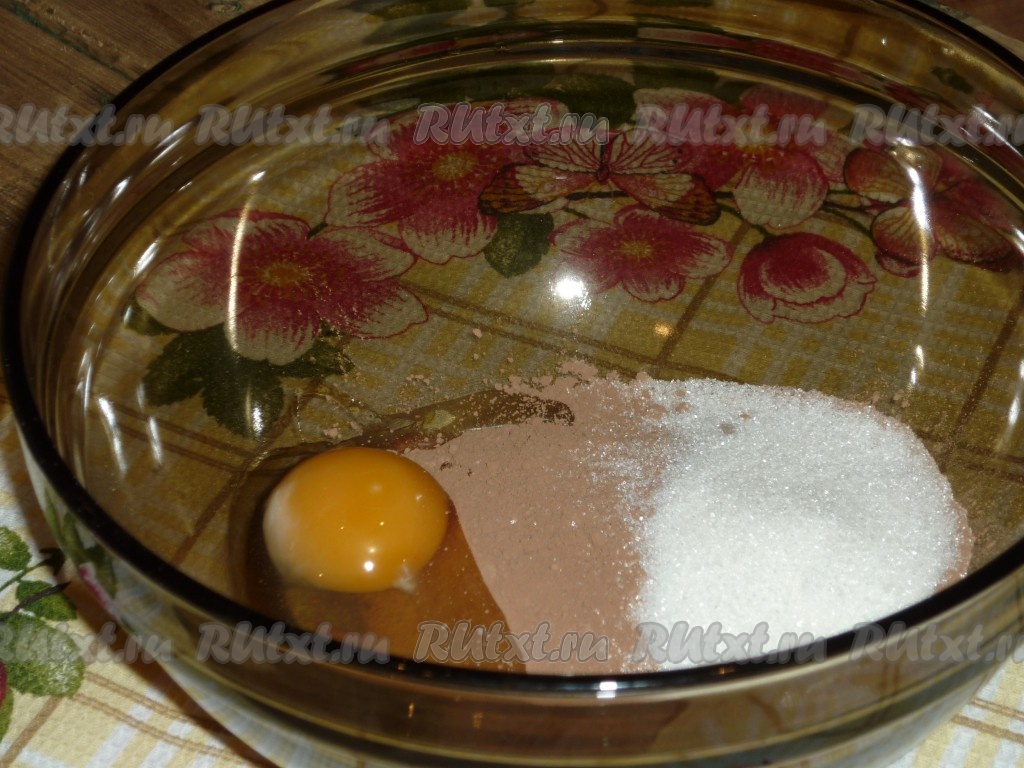 В объёмной миске соединить какао, сахар, яйцо, просеянную муку и соду, тщательно перемешать.