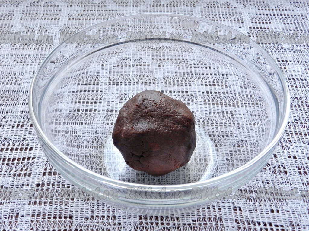 Добавить 1 столовую ложку холодной воды и собрать тесто в комочек. Если тесто не будет собираться в ком, тогда влейте ещё 0,5-1 столовую ложку воды. Завернуть шоколадное тесто в целлофан и убрать в морозилку на 30 минут.
