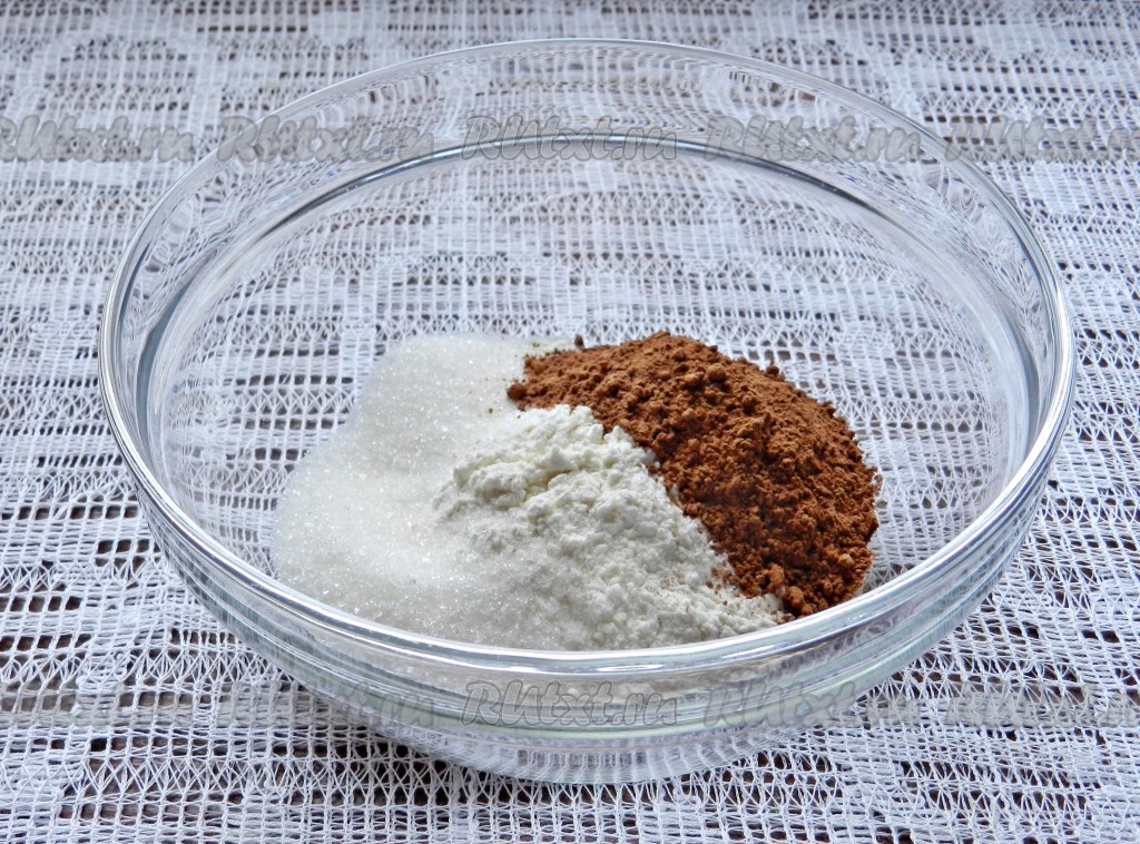Прежде всего замесим тесто для шоколадного слоя, для этого в миске нужно смешать муку, сахар, какао и соль.