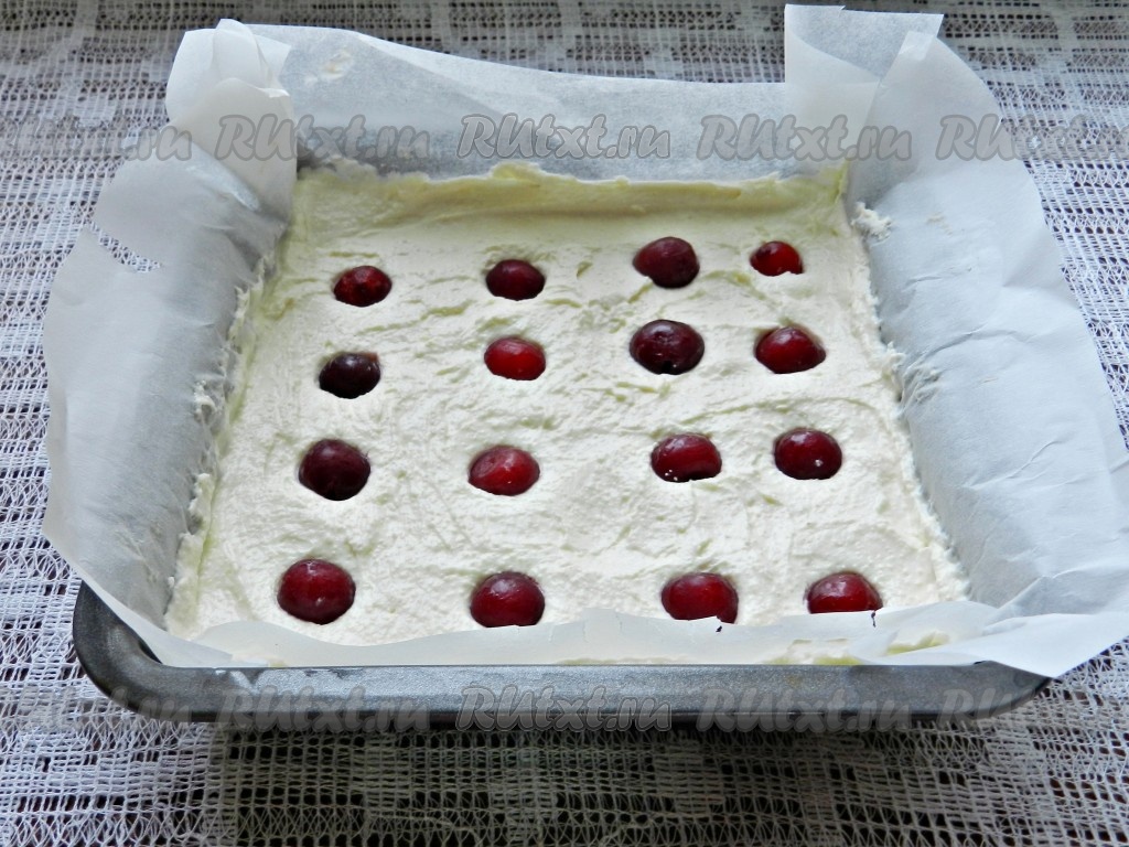 По желанию в запеканку можно добавить ягоды. Я решила использовать вишню. Свежую вишню вымыть, удалить из неё косточки. Замороженные ягоды, если на них мало льда, можно не размораживать. Разложить вишню поверх творожно-манного слоя, слегка вдавить, как на фото.