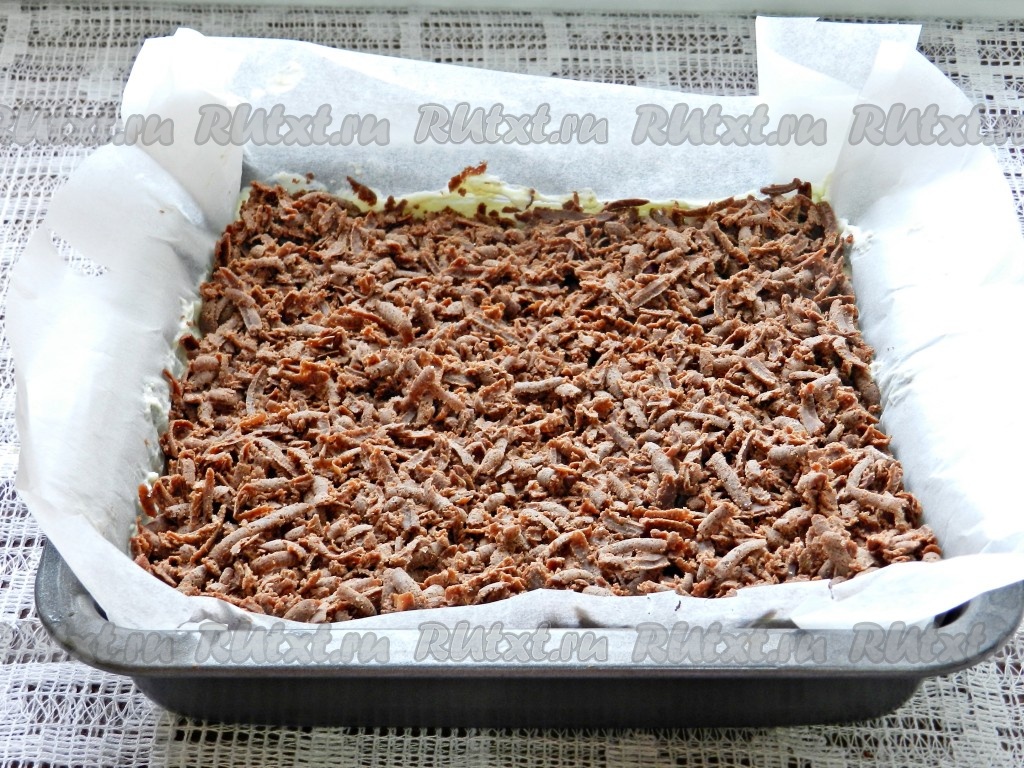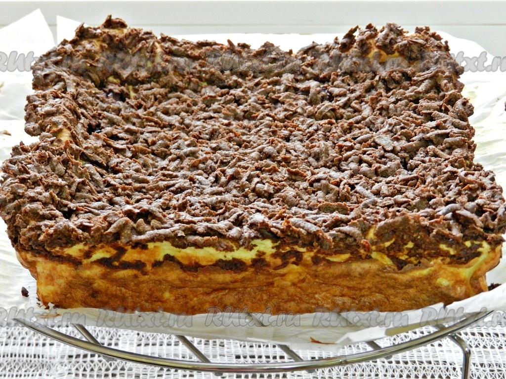 Сверху натереть на крупной тёрке замороженное шоколадное тесто, распределить равномерно. Выпекать творожно-шоколадную запеканку в разогретой до 180 градусов духовке в течение 1 часа. Затем духовку выключить, а запеканку не вынимать ещё 10-15 минут.