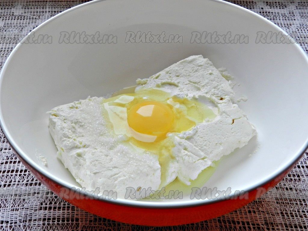 Для замешивания творожного слоя нужно в отдельную миску выложить творог, добавить сырое яйцо, сахар и ванильный сахар, растереть вилкой до однородности. Добавить сметану и перемешать до однородности.