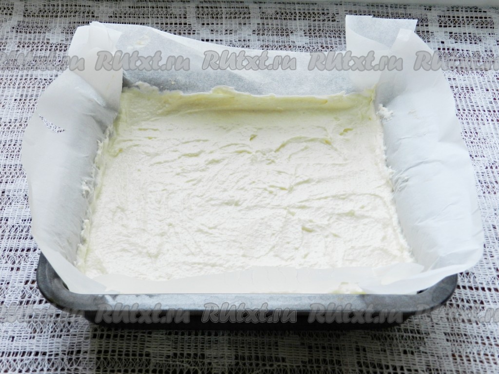 Форму для выпечки (я взяла форму размером 20 на 20 сантиметров) застелить пергаментной бумагой. Немного смазать бумагу сливочным или растительным маслом. Выложить творожно-манную массу и разровнять.