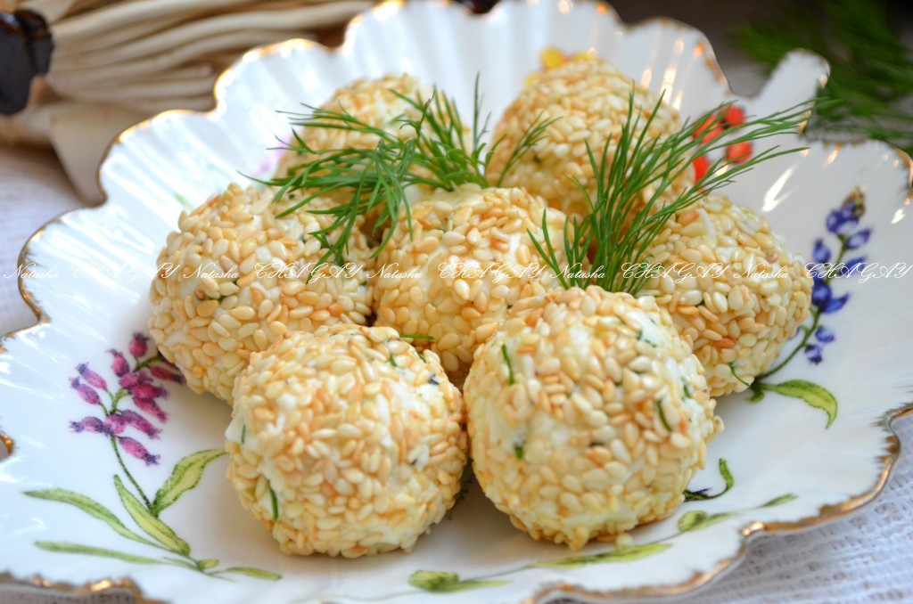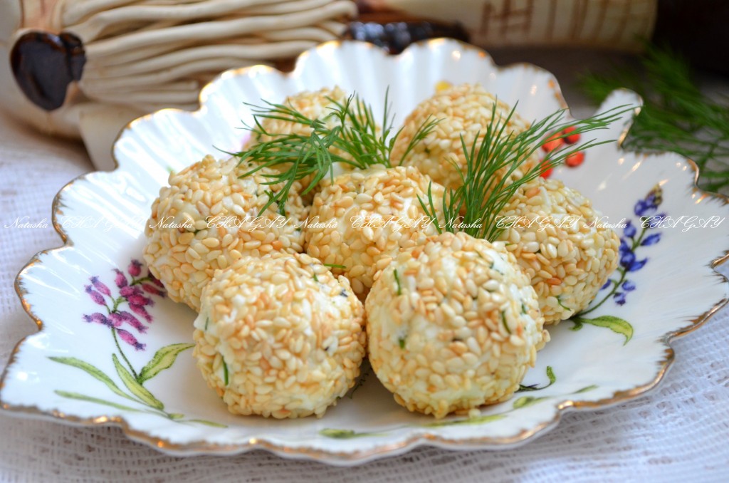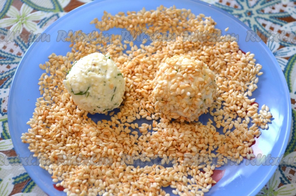 Непосредственно перед подачей обвалять сырные шарики со всех сторон в кунжуте.