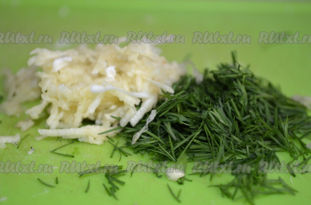 Укроп вымыть, обсушить, мелко нарезать. Очищенные зубчики чеснока натереть на мелкой тёрке (или пропустить через пресс).